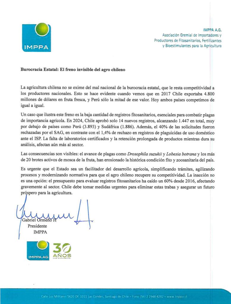 Es urgente que el Estado sea un facilitador del desarrollo agrícola, simplificando trámites, agilizando procesos y modernizando normativa para que el agro chileno recupere su competitividad. La inacción no es una opción: el presupuesto para evaluar registros fitosanitarios ha caído un 60% desde 2016, afectando gravemente al sector. Chile debe tomar medidas urgentes para eliminar estas trabas y asegurar un futuro próspero para la agricultura.